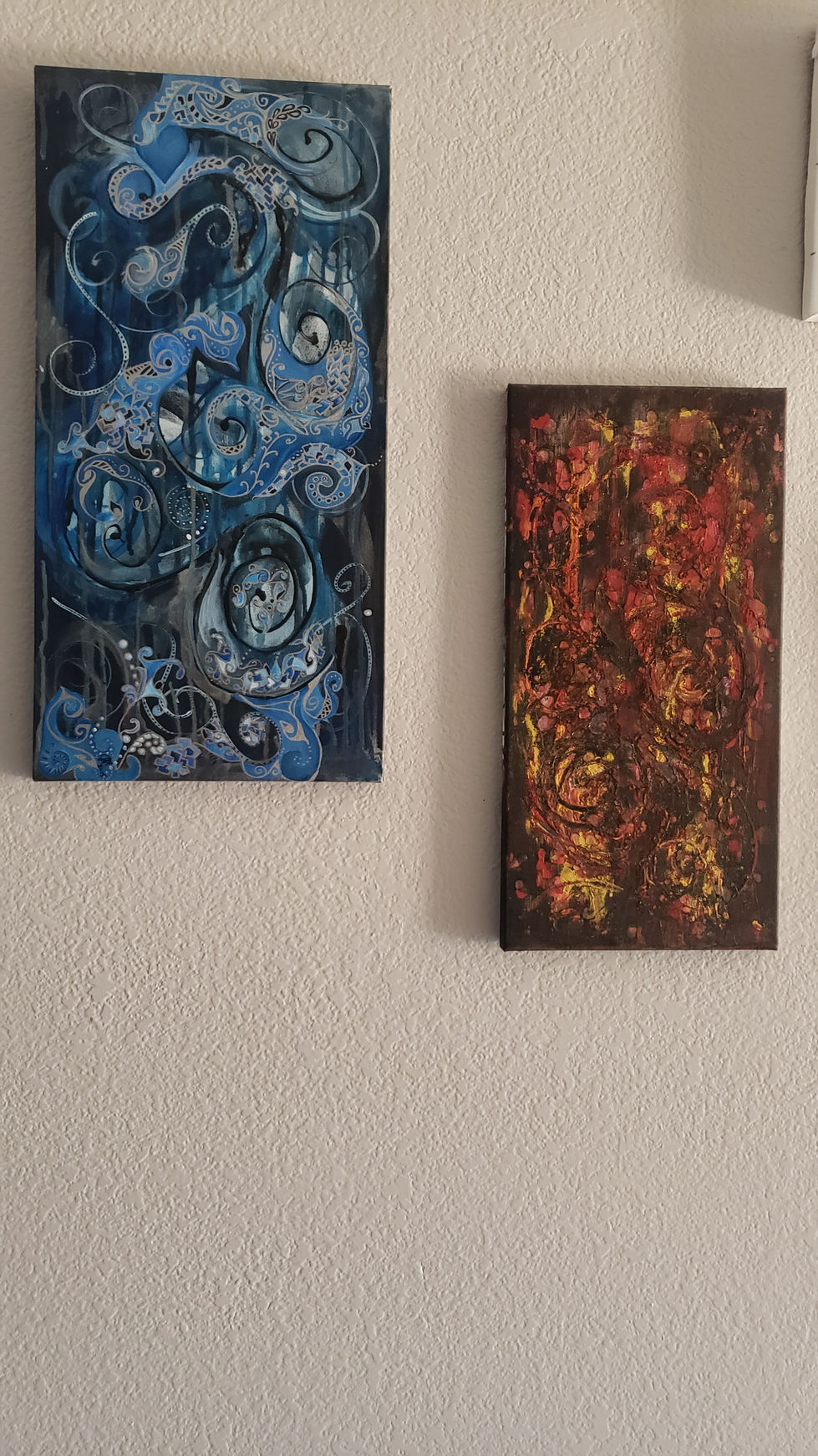 Usually done in acrylics on canvas, the mediums can vary from piece to piece